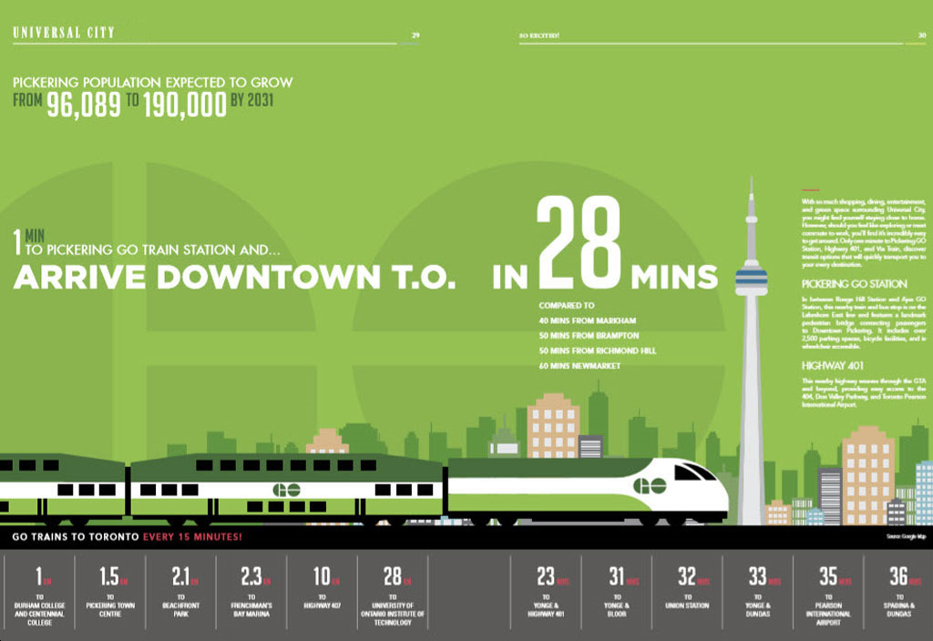 A short 7-minute walk will bring Universal City residents to the Pickering GO Station where an express train brings commuters to Union Station in 25 minutes.