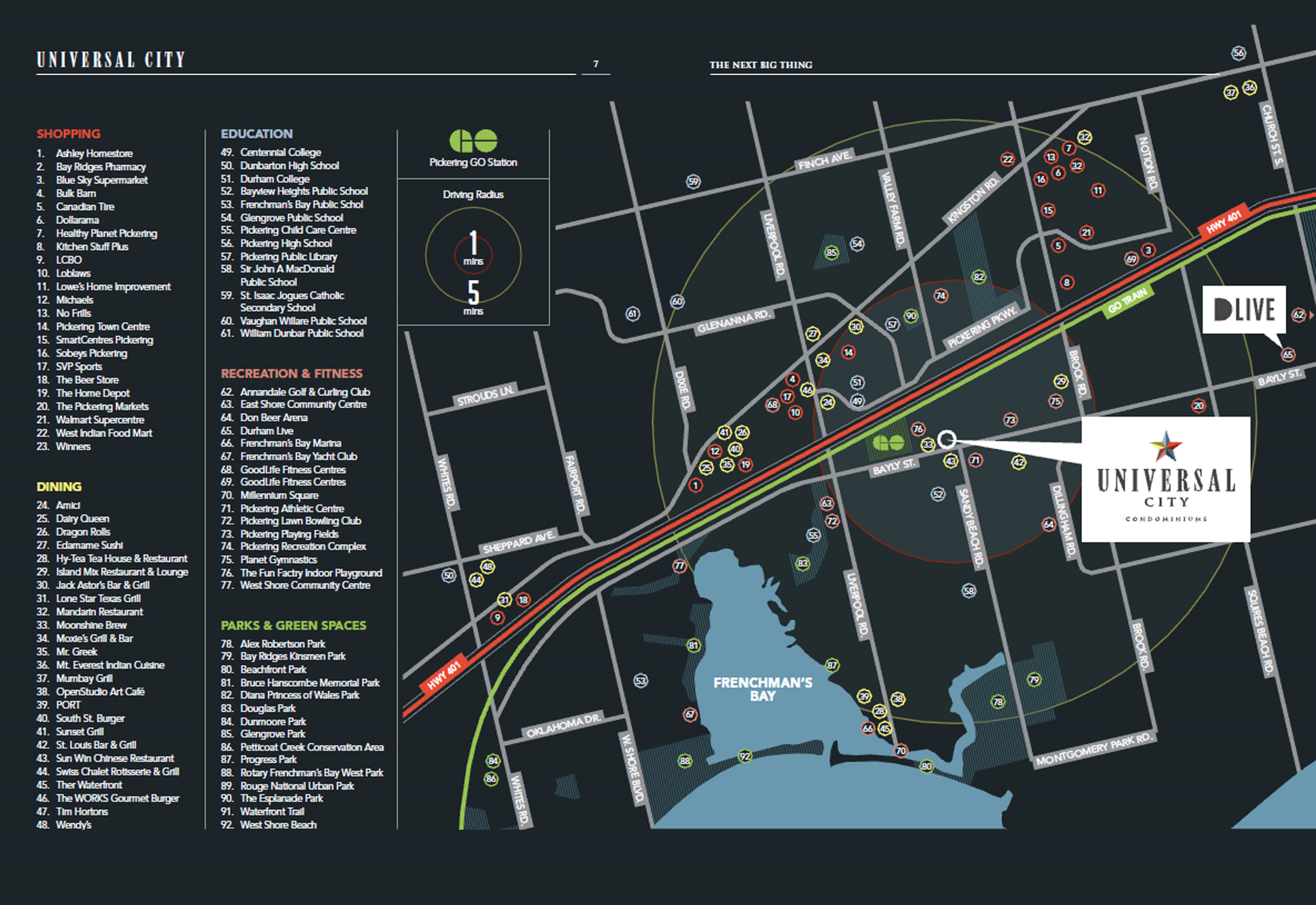 Universal City Condos is located within close proximity to prestigious schools, beautiful parks, big box stores, The Pickering Recreation Complex, transportation and shopping.